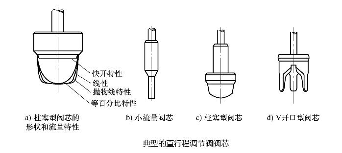 3)阀芯设计。为了获得不同的阀门特性,阀芯的结构多种多样,一般分为直行程和角行程两大类。单座式调节阀一般都是顶部导向的直行程调节阀,采用多的是柱塞型阀芯、V开口型阀芯和套筒型阀芯,以及用于小流量的针形或圆柱铣槽阀芯,还有抗空化汽蚀的多级阀芯和特殊设计阀芯,如图下图所示。