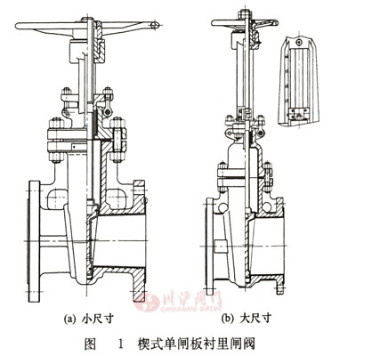 (4)衬氟闸阀典型结构图闸阀主要由阀体、阀盖或支架、阀杆、阀杆螺母、闸板、阀座、填料函、密封填料、填料压盖及传动装置组成,图1是典型的法兰连接明杆楔式单闸板衬氟闸阀。对于大口径衬氟闸阀,为了减少启闭力矩,可在阀门邻近的进出口管道上并联旁通阀(氟塑料衬里截止阀),使用时,先开启旁通阀,使闸板两侧的压力差减少,再开启闸阀。旁通阀公称直径不小于DN32。