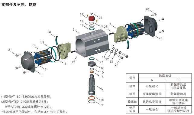 8、齿条背面的复合材料轴瓦和活塞导向环以及输出轴的轴承等为防止金属对金属的摩擦,并且增加润滑,使其低摩擦、长寿命。